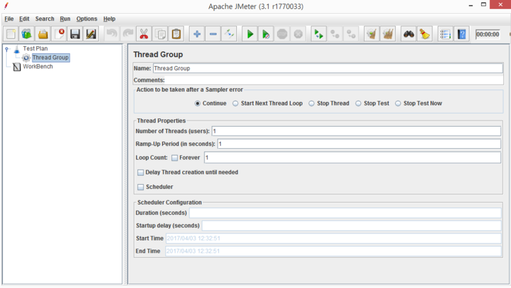 A Thread Group defines a pool of users that will execute a particular test case against your server. In the Thread Group GUI, you can control the number of users simulated (num of threads), the ramp up time (how long it takes to start all the threads), the number of times to perform the test, and optionally, a start and stop time for the test. See also tearDown Thread Group and setUp Thread Group . When using the scheduler, JMeter runs the thread group until either the number of loops is reached or the duration/end-time is reached - whichever occurs first. Note that the condition is only checked between samples; when the end condition is reached, that thread will stop. JMeter does not interrupt samplers which are waiting for a response, so the end time may be delayed arbitrarily. |