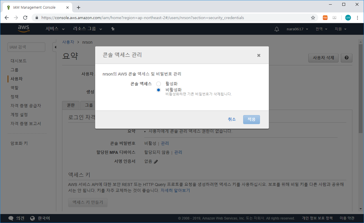 먼저 우측 상단의 계정 정보(nara0617) -> 내 보안 자격 증명을 선택합니다.
