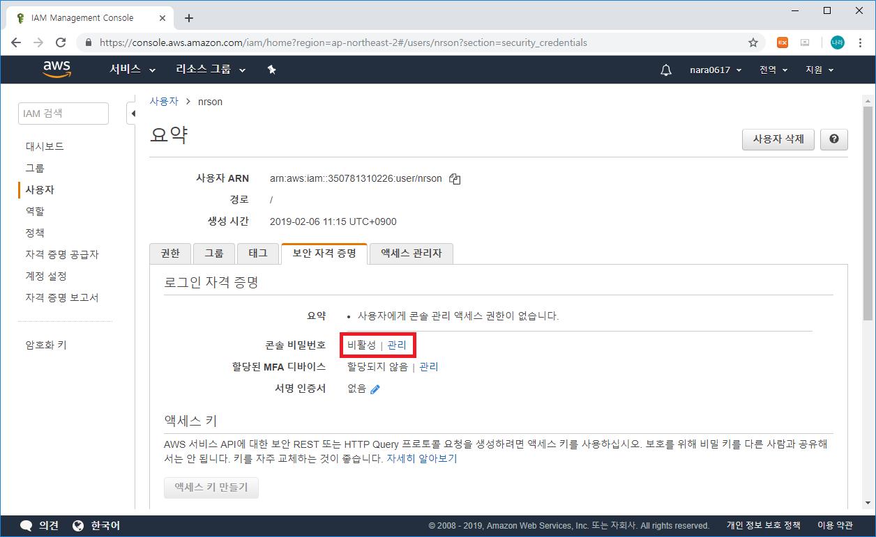 최초 보안 자격 증명의 콘솔 비밀번호는 비활성 상태로 생성됩니다.