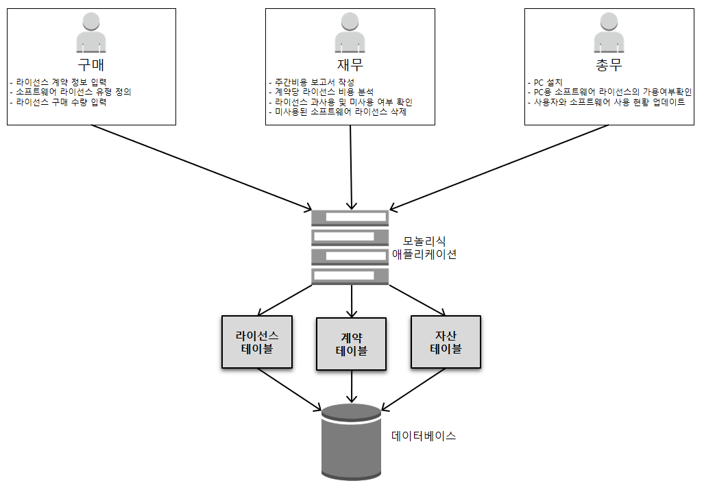 위와 같이 구매, 재무, 총무팀의 각 업무 담당자는 하나의 애플리케이션에 접속하여 하나의 데이터베이스에 접근하게됩니다.