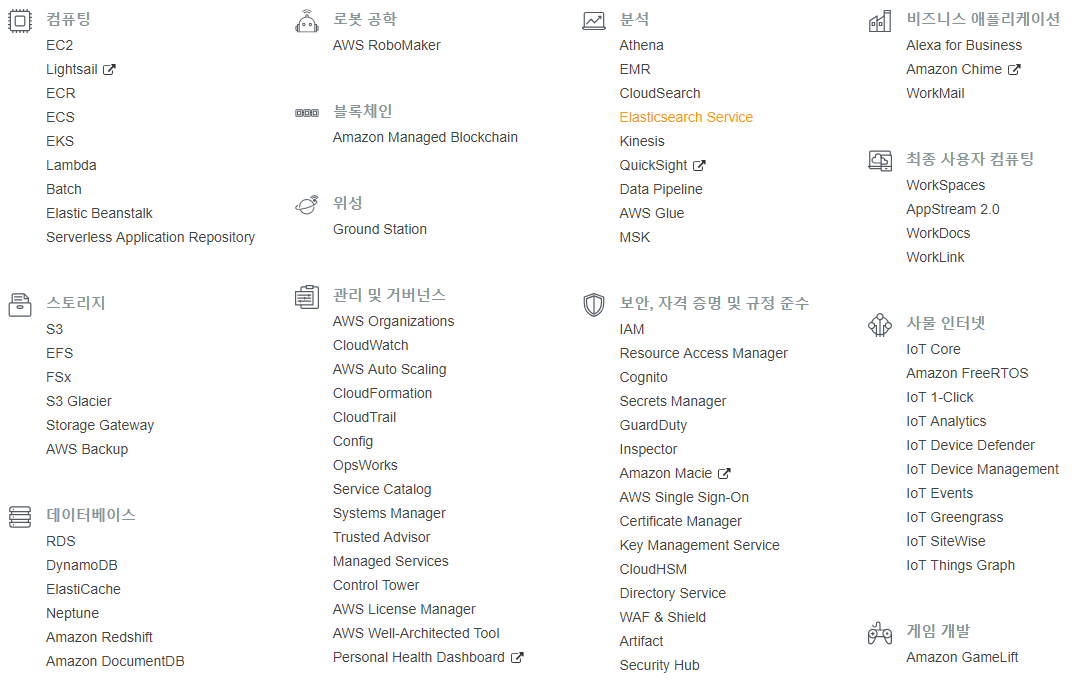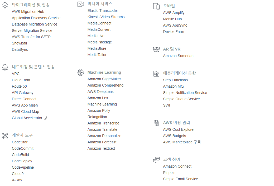 위와 같이 2019-03-31 일요일 기준 서울리전에서는 23개 카테고리에 139개의 서비스가 공개되고 있습니다.