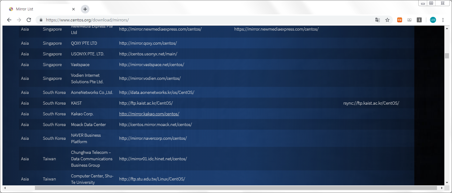 위 사이트에 접속하면 CentOS에서 사용 가능한 다양한 미러 리스트를 확인할 수 있습니다.