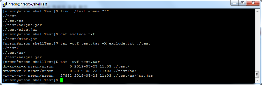 c) 압축 실행 : tar -cvf test.tar -X exclude.txt ./test