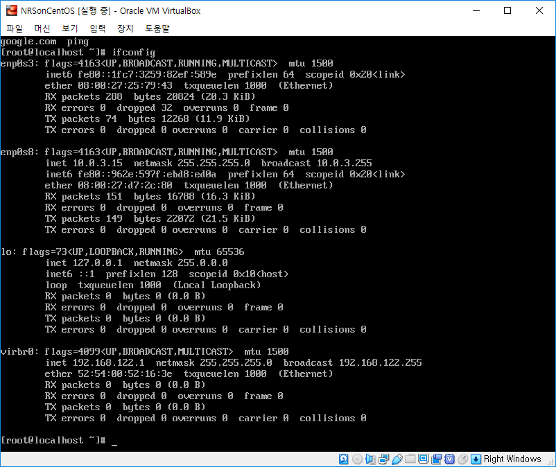 - 네트워크 설정 후에도 ping google.com or ping 8.8.8.8을 찾지 못 할 경우 ifdown enp0s3 / ifup enp0s3으로 재기동을 진행합니다.