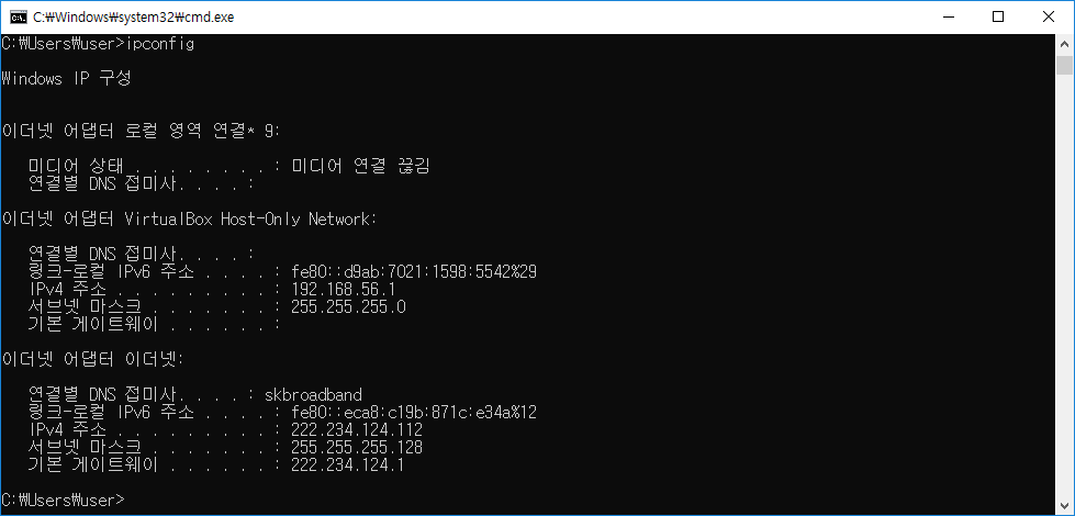 Local PC에서 ipconfig 명령어를 치면 VirtualBox Host-Only Network로 이더넷 어댑터가 설정된 IPv4 주소입니다.