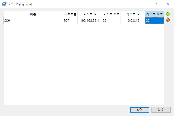 앞서 살펴본 정보를 기반으로 SSH / TCP / 192.168.56.1 / 22 / 10.0.3.15. / 22를 기입하고 확인을 선택합니다.