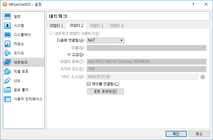 먼저 네트워크 설정 -> 어댑터 2 -> NAT를 추가합니다.