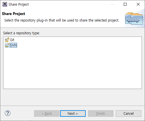 프로젝트 우클릭 > Team > Share Project를 선택하면 다음과 같은 화면으로 이동한다.