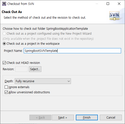 checkout svn://192.168.56.100/SpringBootApplicationTemplate -r HEAD --depth=immediates --force