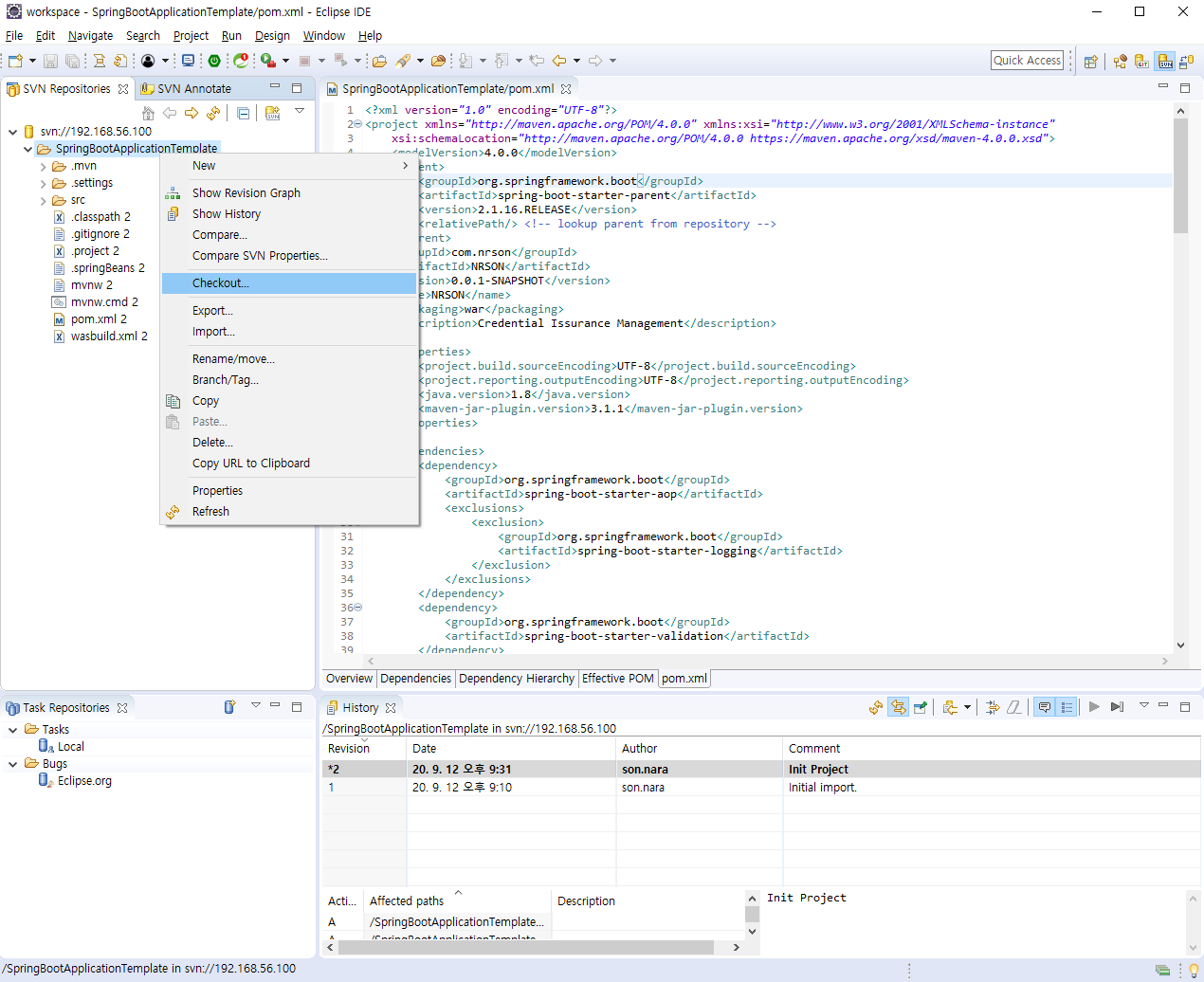 앞서 처음으로 생성한 SpringBootApplicationTemplate Project에서 파일을 수정하여 Commit하고 SpringBootSVNTemplate 프로젝트에서 업데이트하는 과정을 살펴보도록 하자.