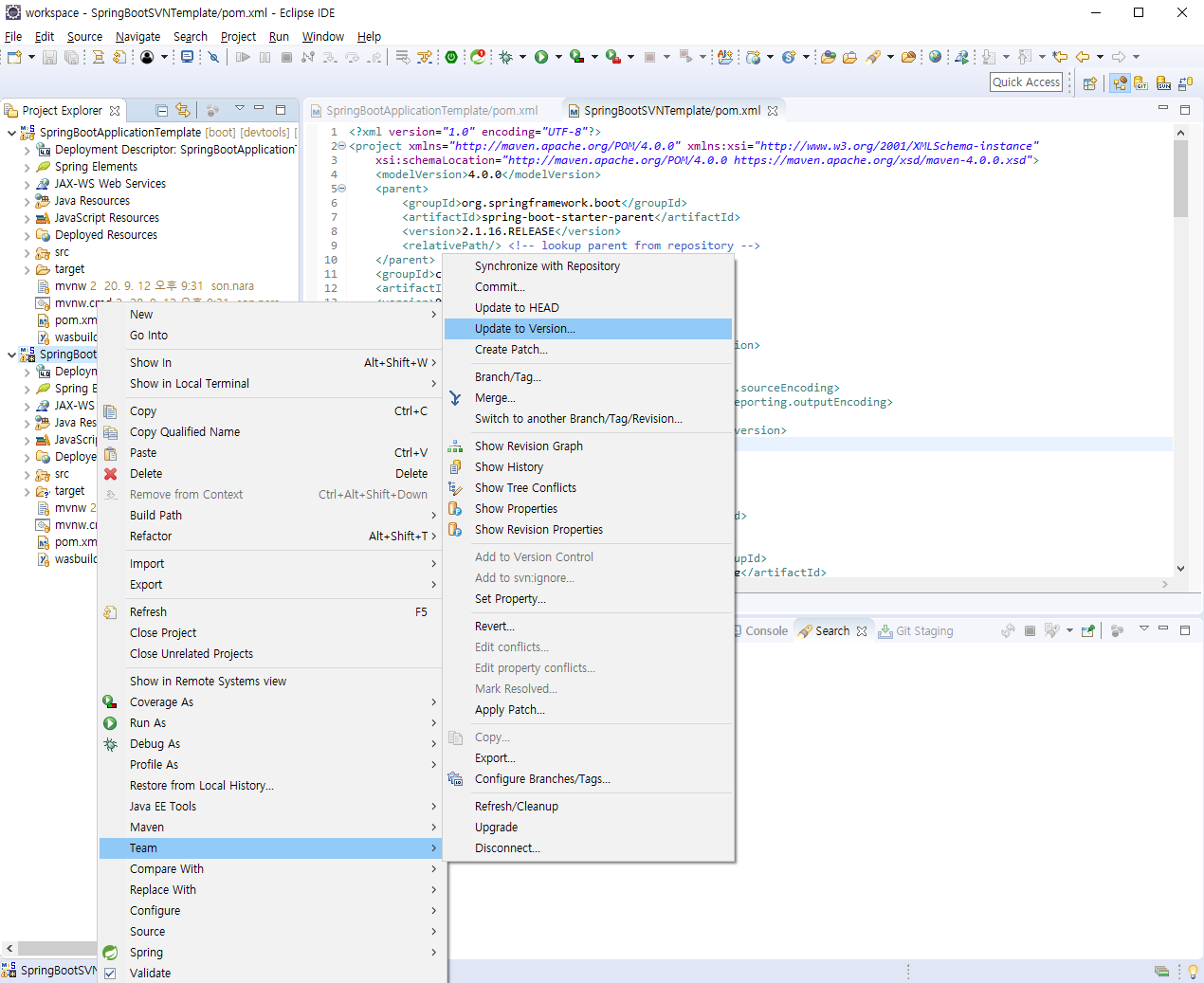다음으로 SpringBootSVNTemplate 프로젝트에서 Update를 받아보자.