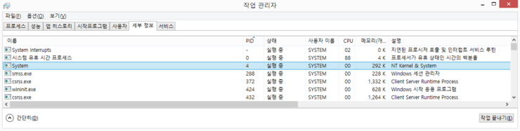 Process ID는 4인것을 확인했고 작업 관리자 창에서 해당 Process가 무엇인지 확인해 볼까요?