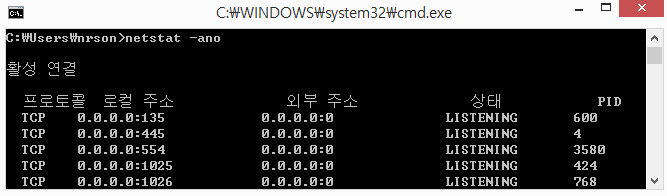 netstat -ano 명령어로 확인이 가능합니다.