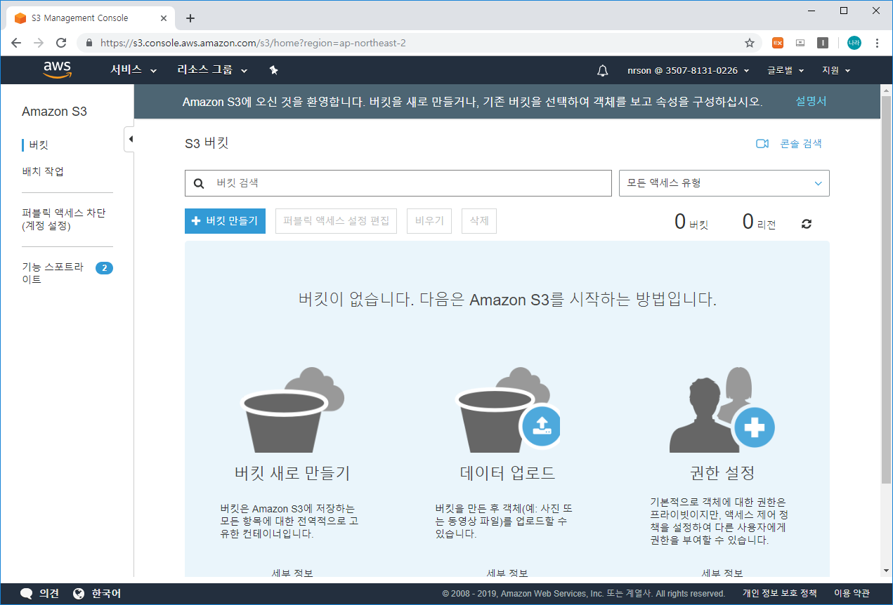 예를들어 아래와 같이 nrson이라는 bucket name은 전 세계에 유일해야 합니다.