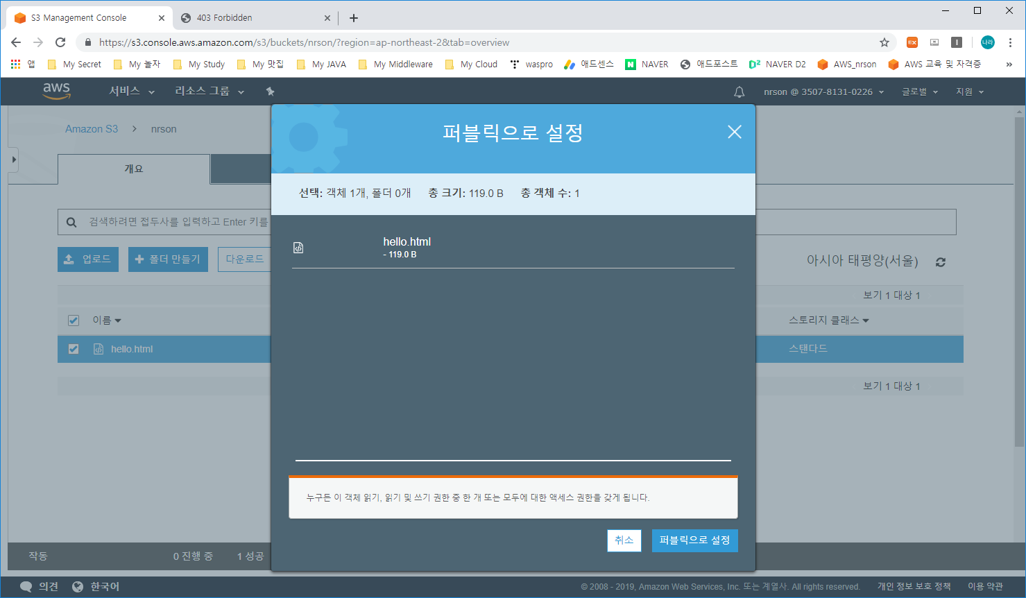 먼저 업로드한 개체를 선택하고 작업 -> 퍼블릭으로 설정을 선택