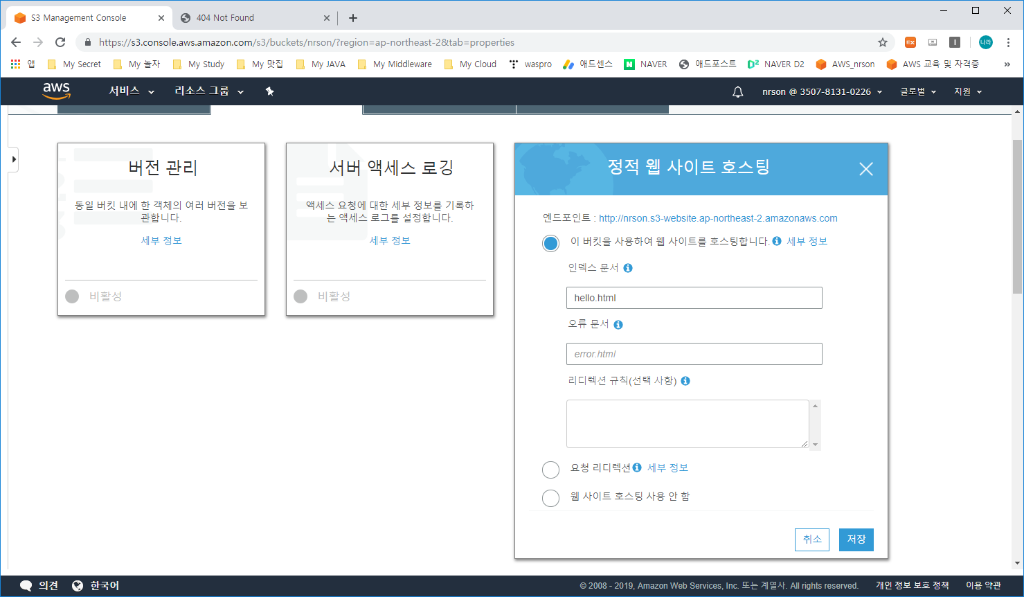 - 먼저 "웹 사이트 호스팅 사용 안 함"에서 "이 버킷을 사용하여 웹 사이트를 호스팅합니다."를 선택하고 인덱스 문서에 hello.html을 입력하고 저장합니다.
