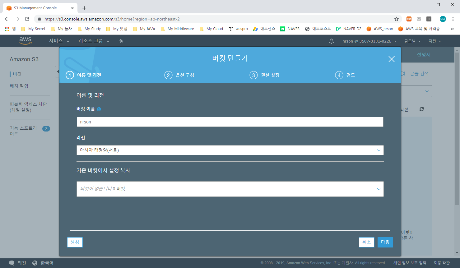 - 저는 제 이니셜인 nrson으로 버킷을 생성하겠습니다.