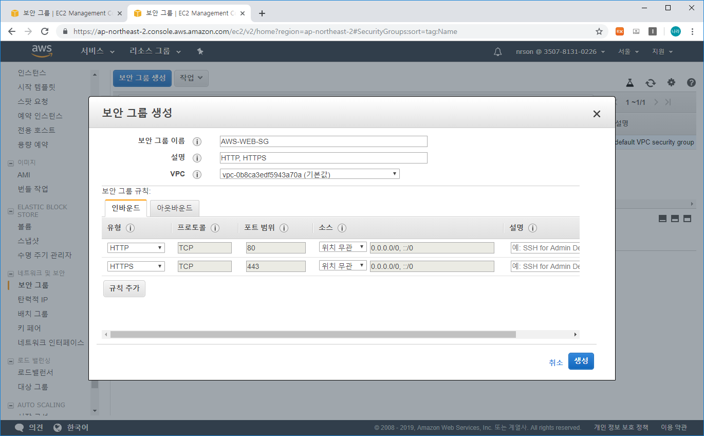 - 각각 웹 서버 용도의 보안 그룹과 데이터베이스 용도의 보안 그룹을 추가합니다.