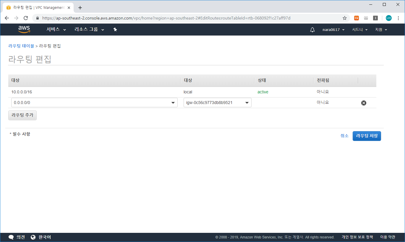 - 라우팅 테이블에 라우팅을 추가한다.