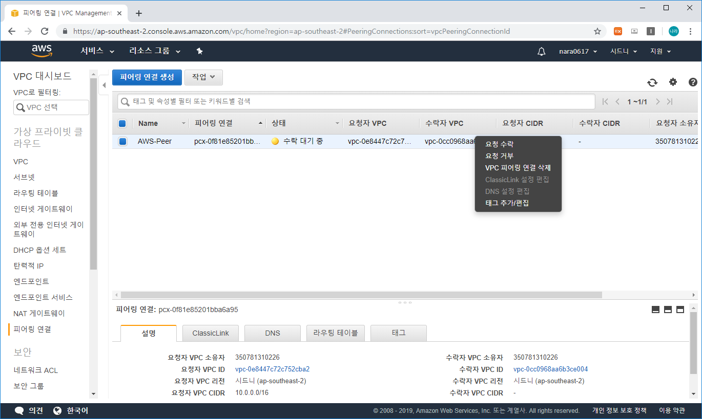- VPC Peering으로 연결을 요청할 경우 Destination 측에서 요청을 허락해 주어야 연결이 가능