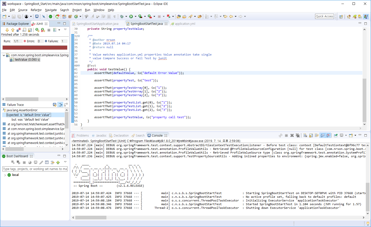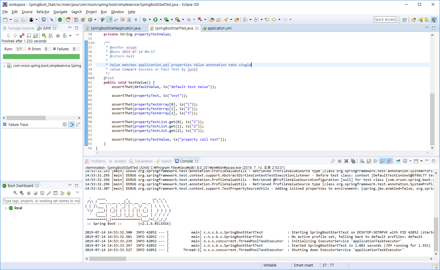 요점만 말하자면, application.yml에 정의 된 Property를 불러와 비교한 후 맞으면 Success, 다르면 Fail을 발생 시키도록 구현한 JUnit Test 과정입니다.
