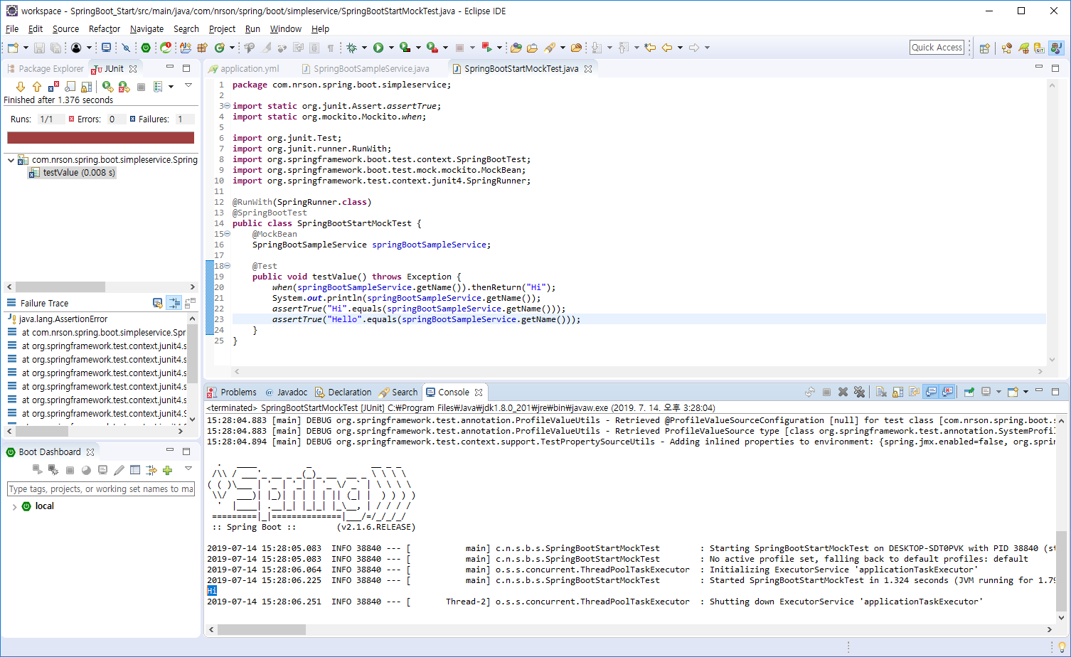 assertTrue를 사용해 JUnit에 테스트 결과를 리턴합니다. 이는 실제 SpringBootSampleService의 결과와 상관없이 앞서 지정한 Hi와 비교를 수행하여 Failures가 리턴됩니다.