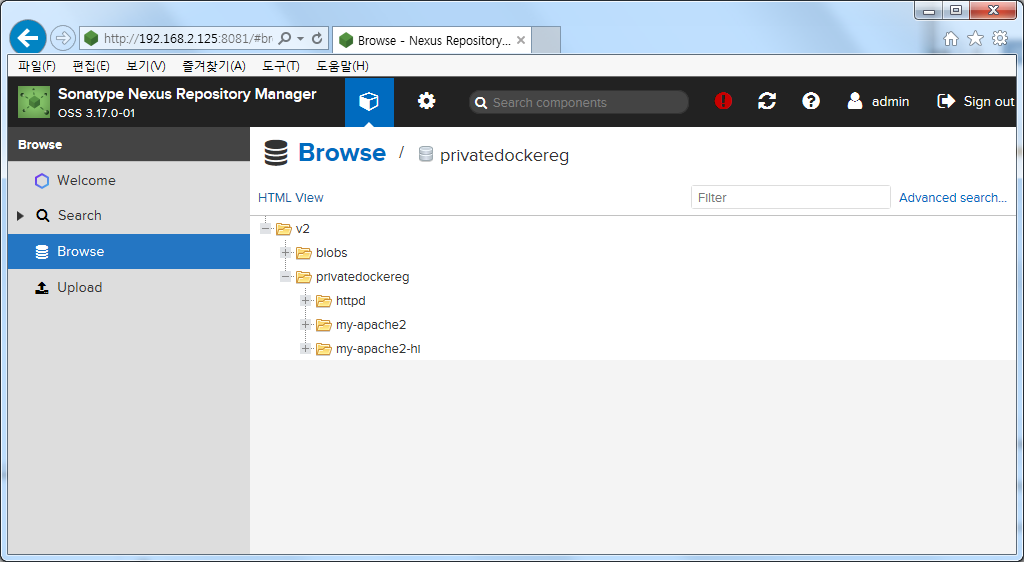 마지막으로 Nexus3 Docker Private Registry에 접속하여 Push 상태를 확인해 보도록 하겠습니다.