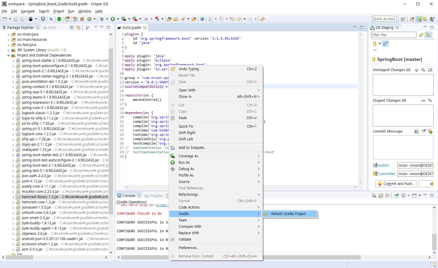 Maven 환경의 pom.xml과 같이 gradle 환경에서는 build.gradle 환경파일을 수정하여 관리합니다.