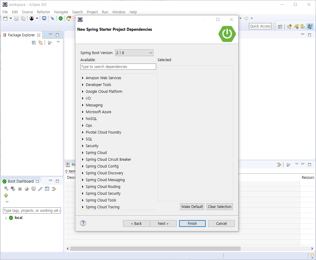 | Spring Boot Dependencies 추가 (본 포스팅에서는 추가하지 않음) → Finish |