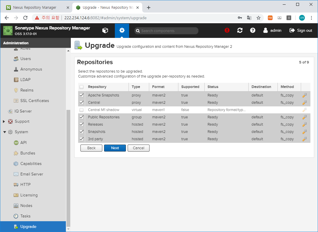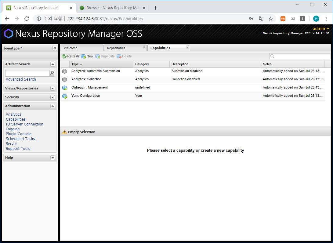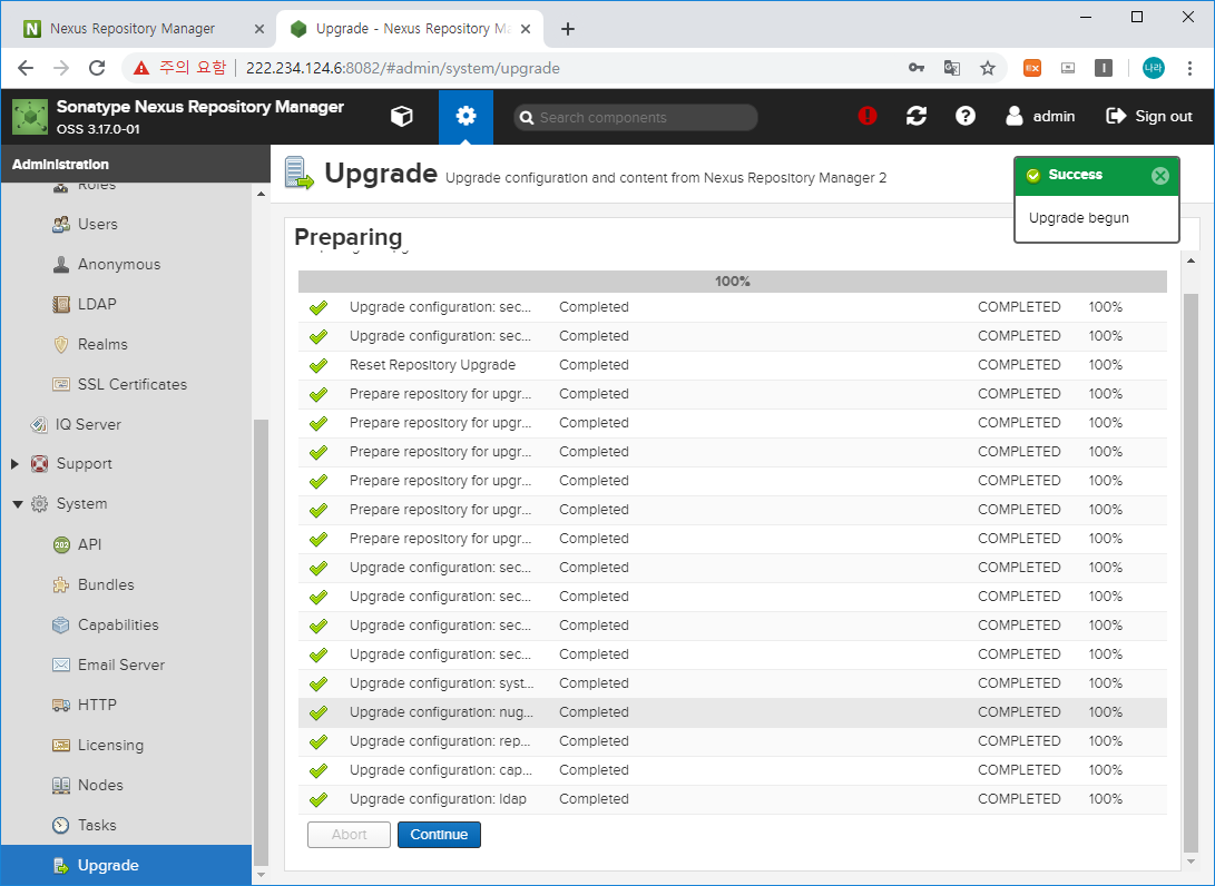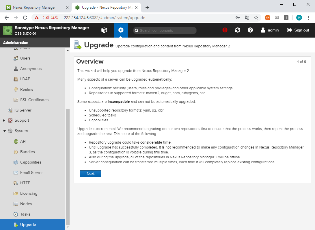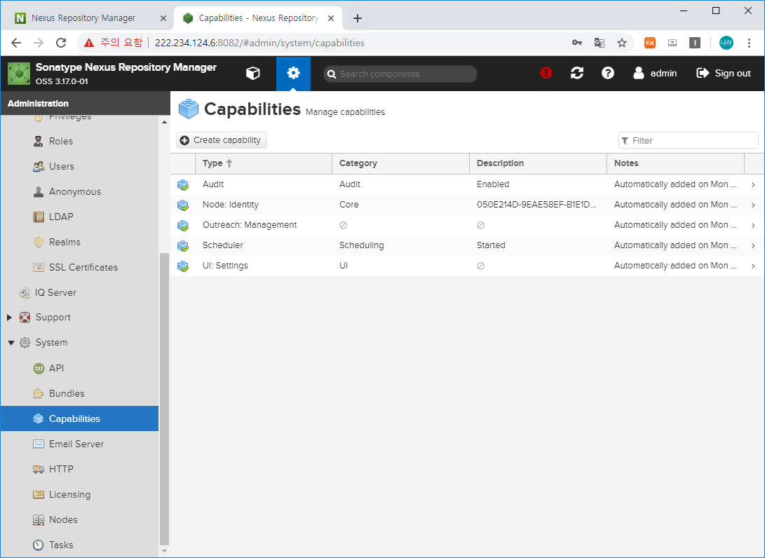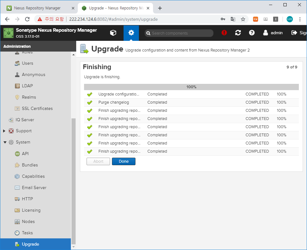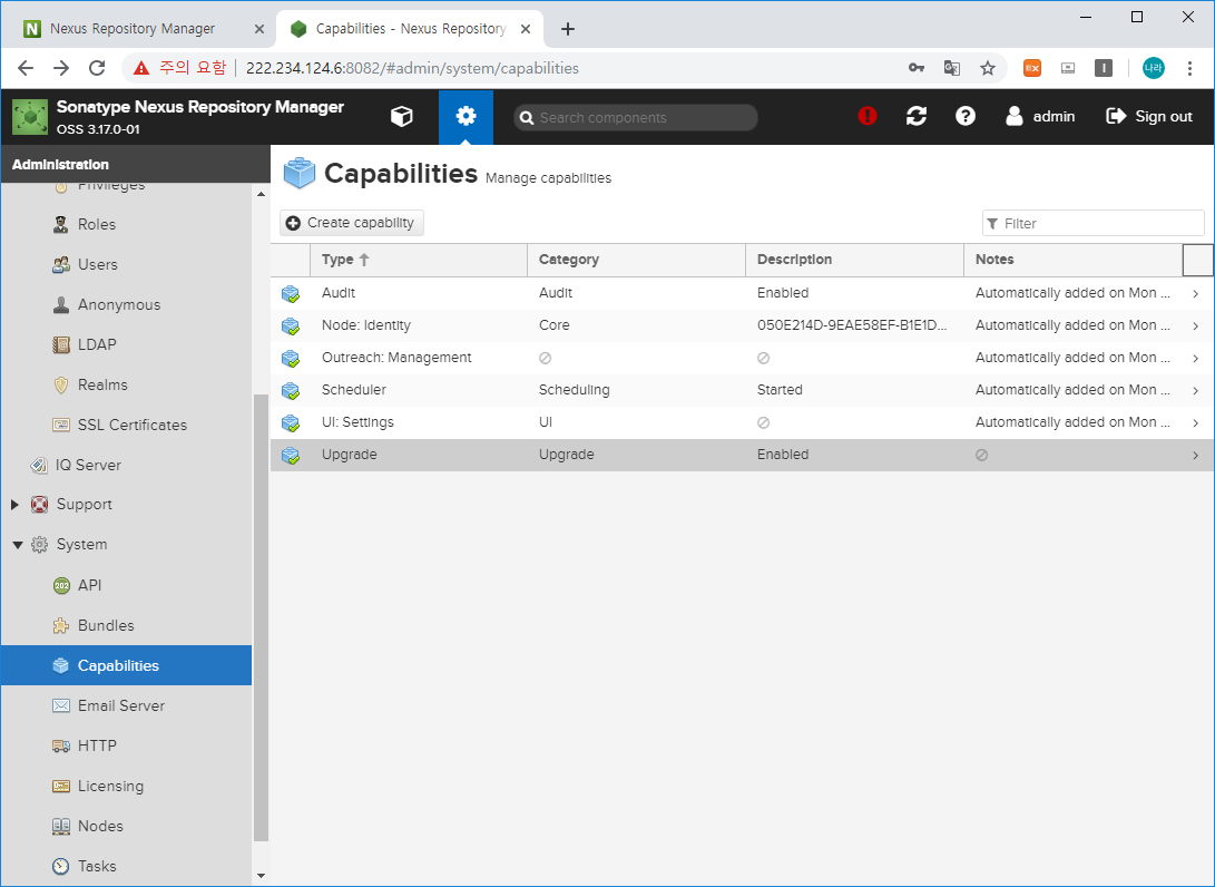 Nexus3에서 Capabilities에서 추가한 Upgrade 항목이 이제 System 하단에 생성되었을 것입니다.
