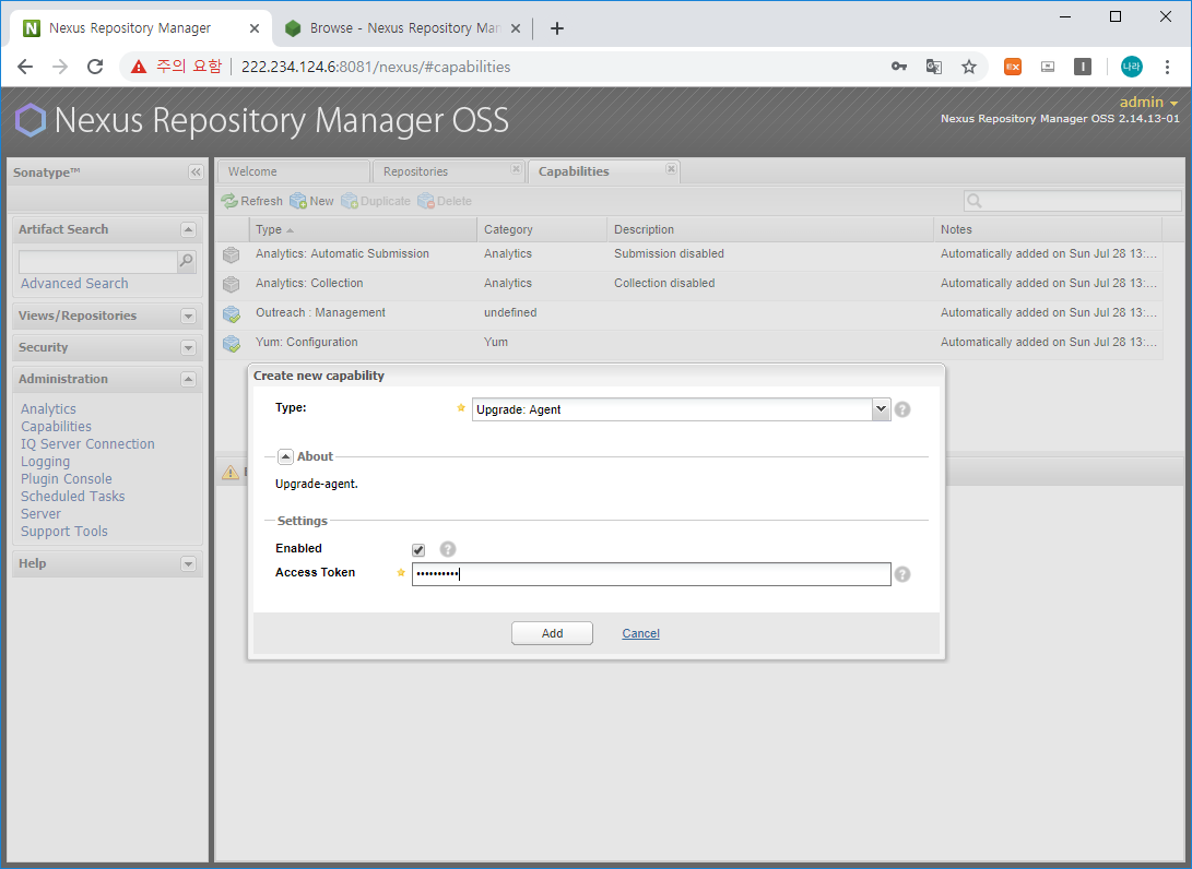 다음으로 Type을 Upgrade: Agent를 선택하고 Access Token으로 Nexus3에서 승인 요청할 토큰을 하나 입력하고 Add 버튼을 클릭합니다.