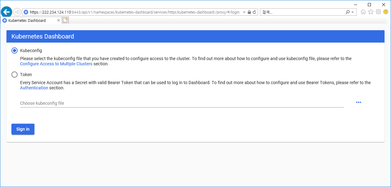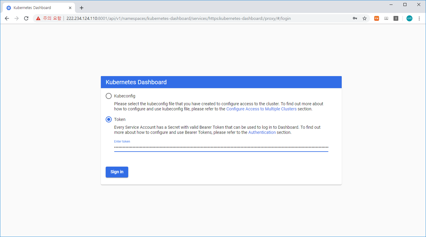 이후 과정은 위와 같이 kubectl proxy 방식과 동일하게 Token 키를 생성하여 접근하면됩니다.