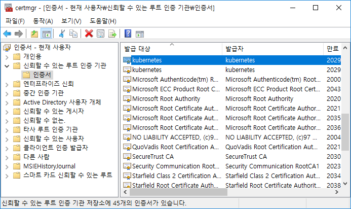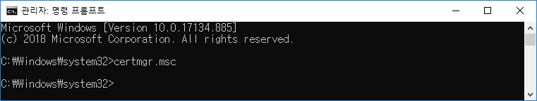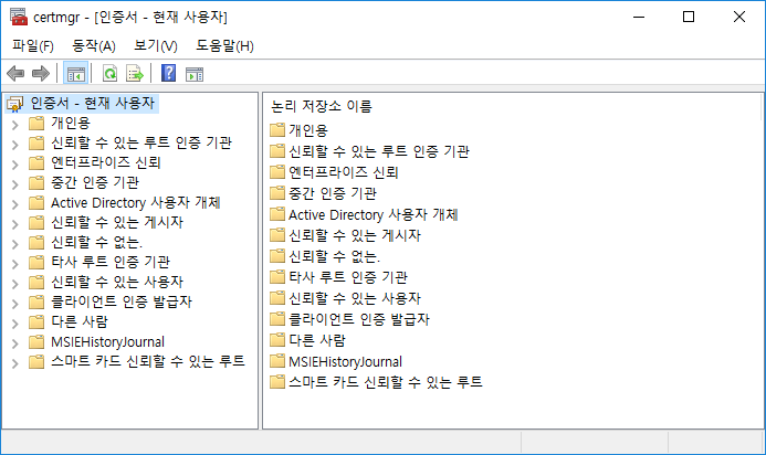혹시나 인증서를 갱신하거나 정보가 변경되어 삭제해야 할 필요가 있을 경우에는 certmgr.msc 명령어를 이용하여 인증서를 확인할 수 있습니다.
