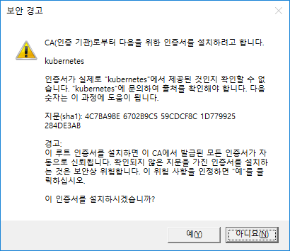 위 명령어 입력 시 아래와 같은 인증서 설치 여부를 묻게 되며 예를 선택하면 모든 준비가 완료됩니다.