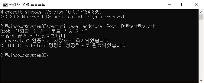 다음으로 개인용 인증서를 적용합니다. (certutil.exe -p [인증키 생성시 PW] -user -importPFX D:\cert\kubecfg.p12)