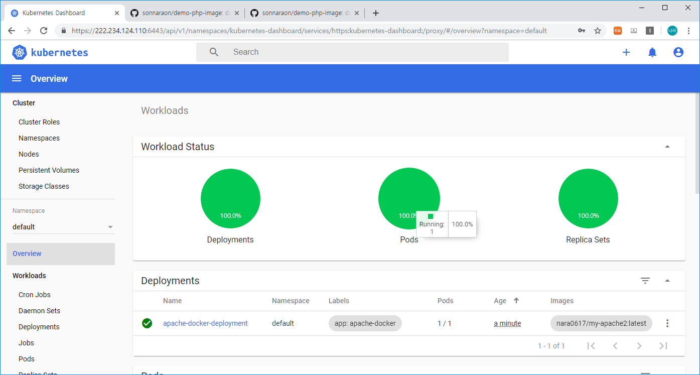 Pod Information의 기동 된 Node 정보를 확인하고 해당 서버에서 직접 접속해 보도록 하겠습니다.