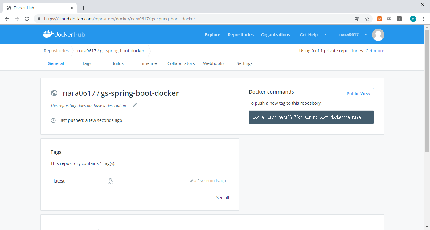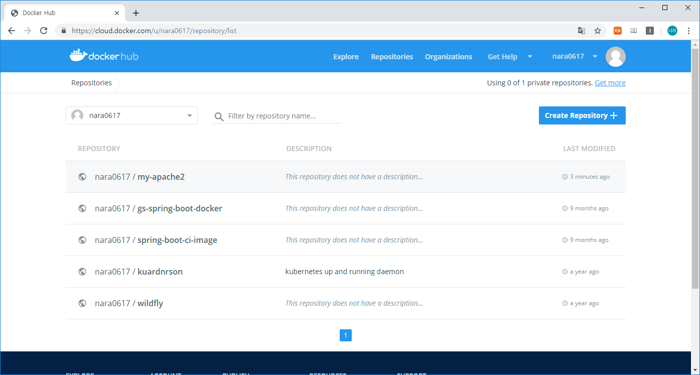 위와 같이 nara0617/my-apache2 이미지가 업로드된 것을 확인할 수 있습니다.
