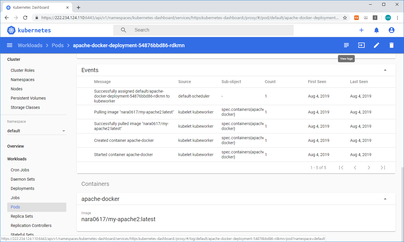 위와 같이 pod 이름을 클릭하면 생성된 Container의 정보가 출력되며 로그를 클릭하여 문제 발생 여부를 확인할 수 있습니다.