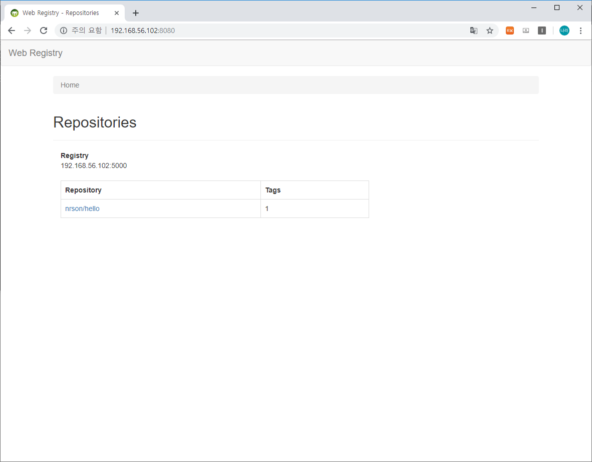 보시는 것처럼 방금전 생성한 192.168.56.102:5000/nrson/hello 이미지가 생성된 것을 볼 수 있습니다.