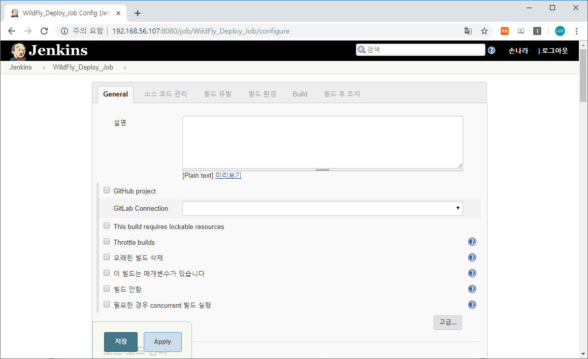 위와 같이 Jenkins FreeStyle project에 대한 상세 설정 화면으로 이동하게 됩니다.