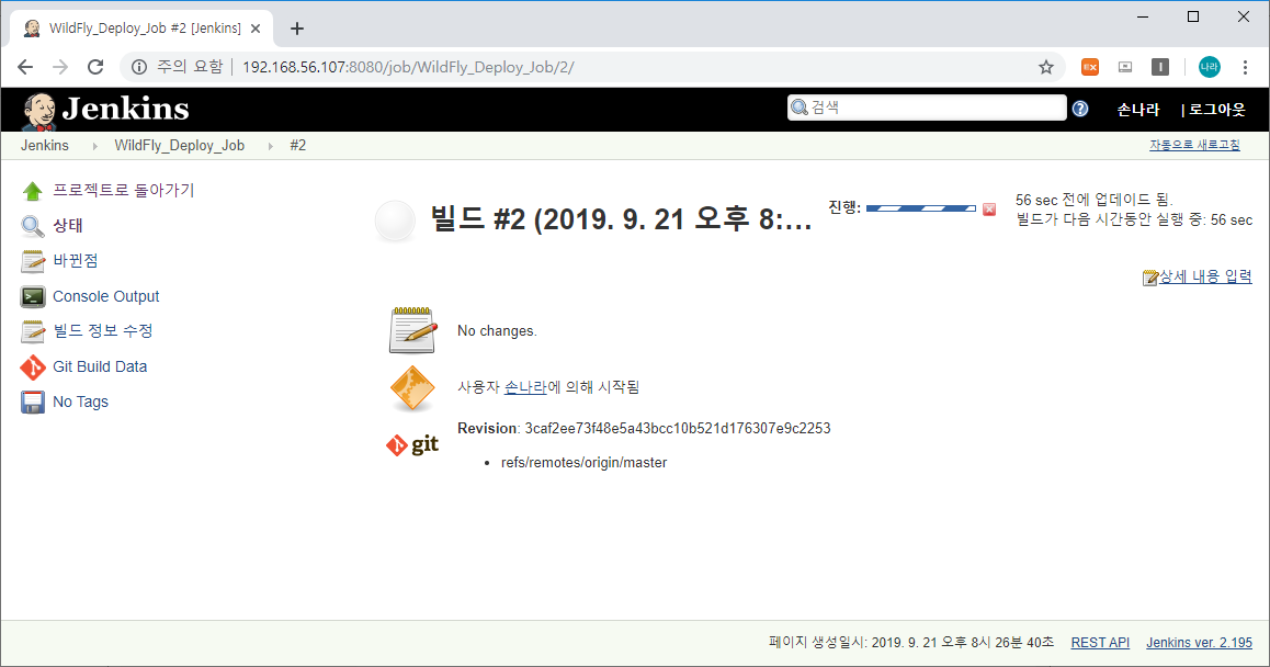 왼쪽 메뉴 하단에는 Build History가 출력되며 #Build_Number(#2)를 클릭하면 다음과 같이 해당 빌드의 상세 정보를 확인할 수 있는 화면으로 이동됩니다.