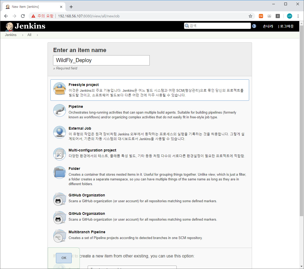 다음으로 WildFly에 Application을 Deploy 하기 위한 FreeStyle Project를 생성하는 과정입니다.
