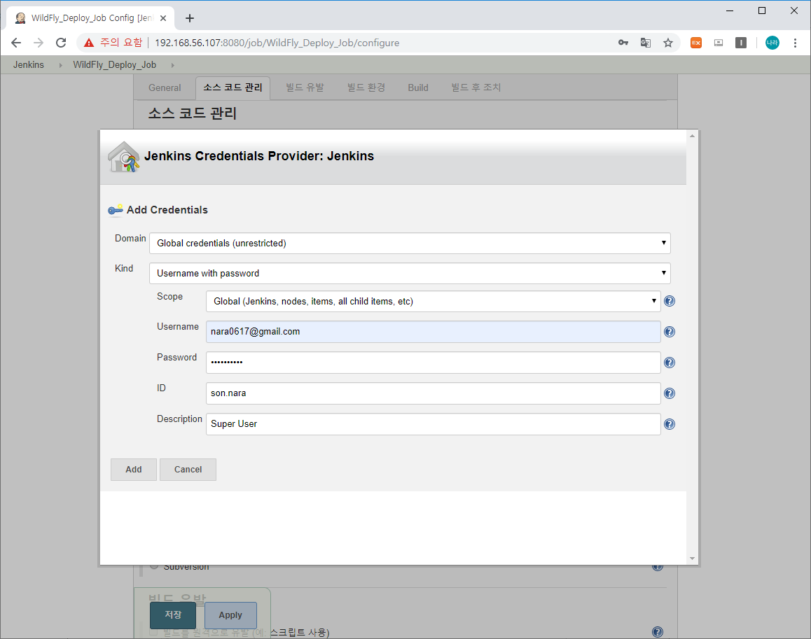 필요한 정보는 github 또는 gitlab의 Username, Password, ID, Description 정보를 입력하고 Add 버튼을 클릭합니다.