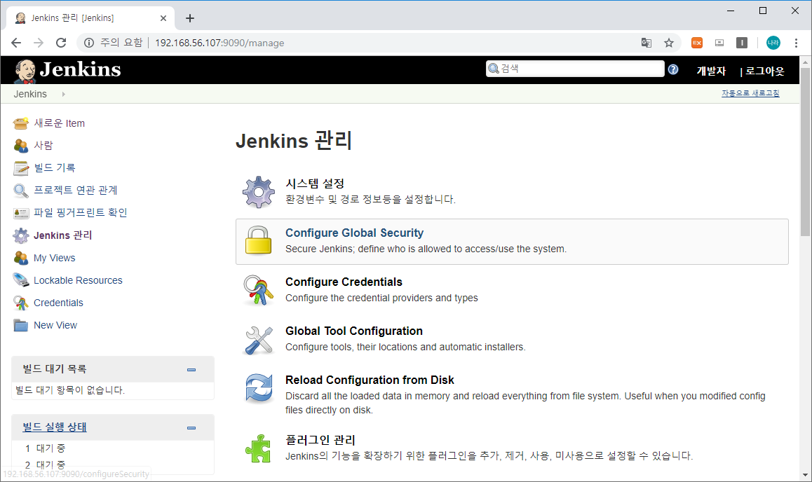 위와 같이 Jenkins 메인 화면 → Jenkins 관리 → Configure Global Secutiry로 이동합니다.