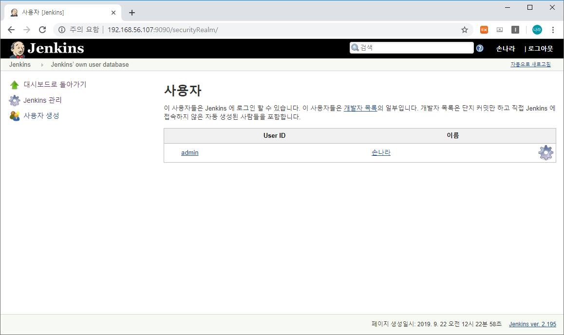 설치 시 생성한 admin 계정이 나타나며, 왼쪽 메뉴 항목 중 사용자 생성을 선택합니다.