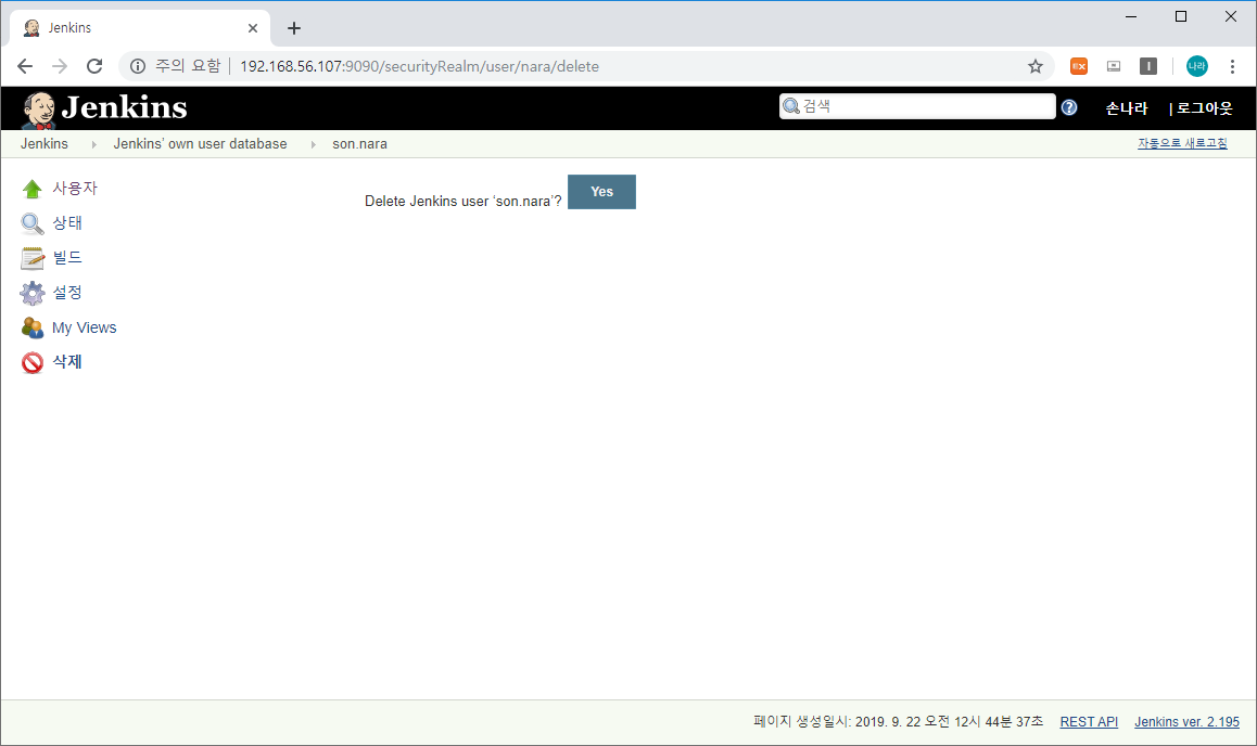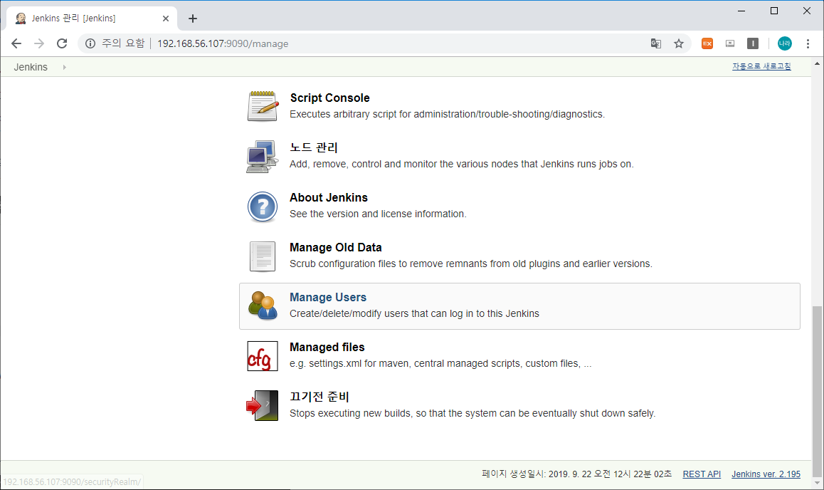 위와 같이 Jenkins 메인 화면 → Jenkins 관리 → Manage Users로 이동합니다.