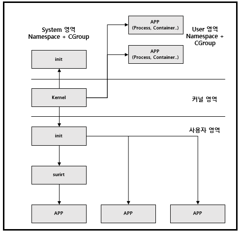 커널의 위쪽은 최근 2.4 버전에서 지원하는 영역으로 Namespace 기반 System 영역과 User영역을 구분하고 있습니다.