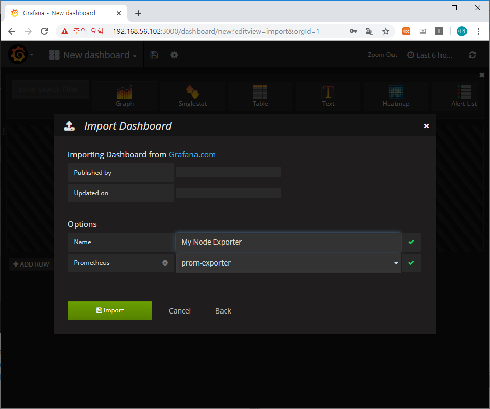 Grafana 접속 정보는 다음과 같습니다. [http://192.168.56.102:3000]