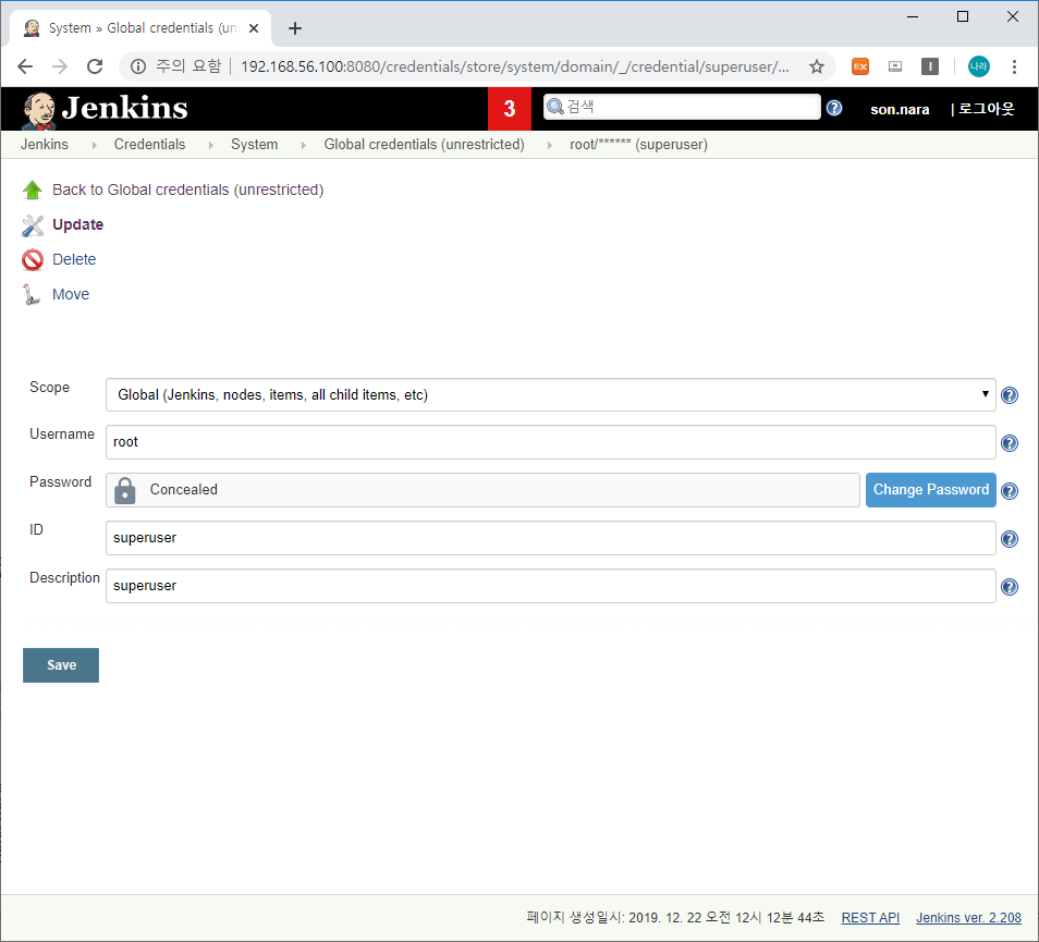 - Jenkins → Credentials → System에서 위와 같이 GitLab 관련 Credential 정보를 입력합니다. Username / Password를 입력하고 ID 정보는 실제 Pipeline에서 사용하는 정보로 Description에 동일하게 입력하여 확인하기 쉽도록 저장합니다.