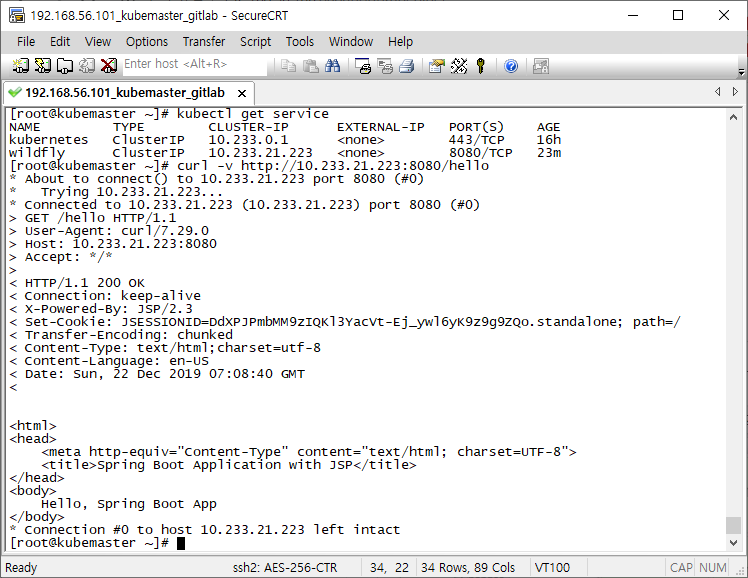 curl -v http://10.233.21.223:8080/hello를 호출해 보니 Hello, Spring Boo App이 정상 호출되는 것을 확인할 수 있습니다.